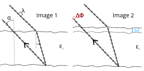 UAVSAR repeat pass interferometry uses two images of the same place but separated in time. Phase changes between the two aquistions are calculated, creating a wrapped interferogram. These phase changes are due to either the wave traveling a longer distance (ground movement or refraction) or change wave speeds (atmospheric water vapor and snow).